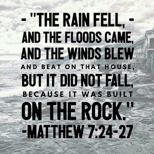"And the rain descended, the floods came, and the winds blew and beat on that house; and it did not fall, for it was founded on the rock."